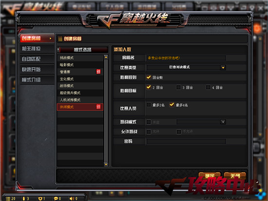 创建房间、休闲模式,玩家可以自行选择 是1V1 还是2V2,回合数包括2回合,3回合,4回合。