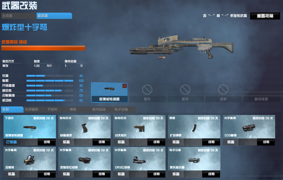 爆炸型十字弩从原有的4配件(快瞄握把,战术枪托,扩容弹匣,激光指示器)补全提升至现在的9配件,增加的配件有霰弹枪转换器,COS瞄镜,全息镜,反射型红点镜,ORS红点镜。