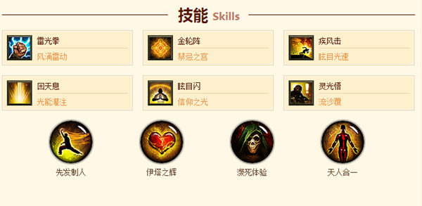 这个BUILD是围绕冷却缩减来构建的。除了护符之外,最好所有装备都带这个属性。在任何一件装备上失去冷却缩减都会给你的生存能力带来显著削弱。从纯数据角度而言,为了这些冷却缩减,你牺牲的暴击率/暴击伤害相当于多少DPS?大概24%吧,但如果你搞到暴击率/暴击伤害/冷却缩减三属性戒指的话,那么这个数字还要更低一点,然而无论如何这都非常值得。全程保持[回天息-光能灌注] =每一拳回复34内力=更多伤害;全程保持[金轮阵-禁忌之宫]=更多伤害和坚韧;几乎全程保持[灵光悟-流沙覆]=更多坚韧,内力和机动性;频繁使用[眩目闪-信仰之光]=更多伤害和成吨的控场。
