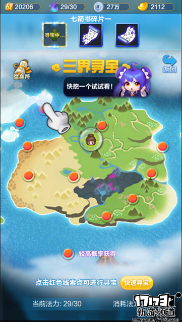 而云游四海玩法更是简单粗暴的点击送礼玩法,在该玩法下玩家仅需要点击屏幕中间,角色即会自动进行探索,随之出现的BOSS战、答题甚至直接奖励宝箱等设定简直让人玩了停不下来。不仅限于云游四海,游戏中玩家想要获取饰品需要通过寻宝任务玩法来获取碎片合成,虽说可以直接挑战其他玩家来以相当高的概率获取碎片,但是直接在小地图上的挖宝玩法也相当有趣,不仅有着各种碎片素材,还有各种金币、钻石等奖励,同样是让人欲罢不能。