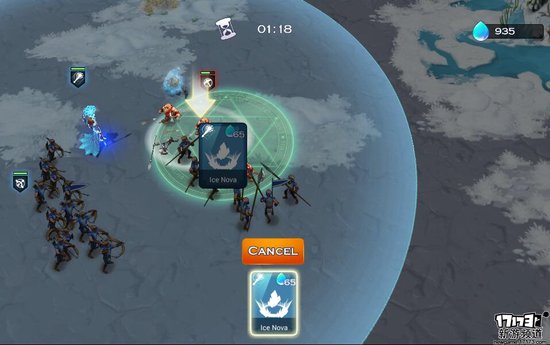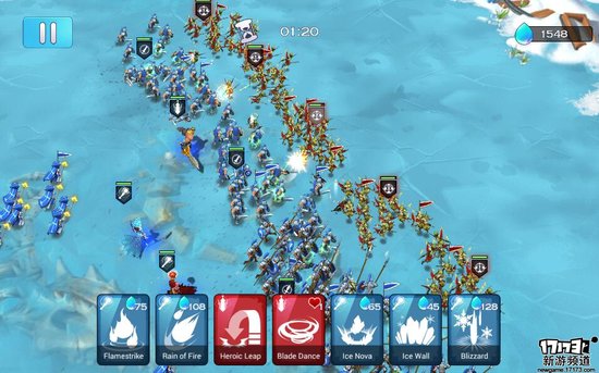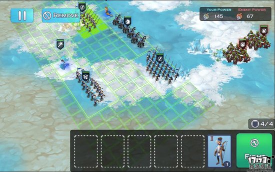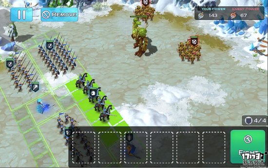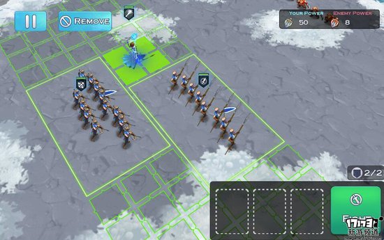 在布置好队形之后,英雄以及部队的行进攻击都是自动进行的,不过玩家能够使用各种英雄技能来改变场上的局势,需要注意的是在一场战斗中每个技能只能够使用一次,并且技能的释放也需要消耗魔法值或者生命值。随着英雄角色的增多以及英雄技能的学习,到了游戏后期基本上游戏中毫无操作性的感觉也就彻底消失,更多的时候你需要考虑的是如何更好地布置队伍以顺利的过关。