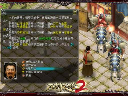 除了有刺激的帮战,加入帮会还有很多好处五、攻城擒王既然守方的帮主替身如此重要,那么对于攻方来说,进入敌方帮址后,就应集中所有火力,快速突破对方防线,直取帮主替身,然后再各个击破守护兽和居民,以达到战争的完美胜利。《刀剑英雄2》的真功夫血性格斗,在追求完美操作的同时,强化了战术和策略在对战中的作用。想体验战鼓齐鸣的热血,金戈铁马的雄壮,这个江湖绝不会让你失望!