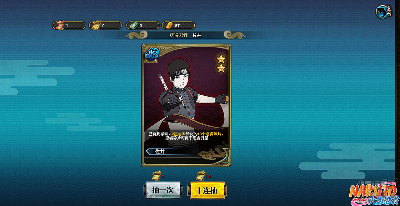 当然一些玩家为了更快捷的招募到自己想要的忍者,可以花费部分点卷/元宝来抽取封印宝箱。宝箱内包含所有特殊以及普通忍者,当然还有一些忍者碎片,运气好的玩家可以获得自来也[三忍大战]、纲手大人、大蛇丸等特殊忍者。