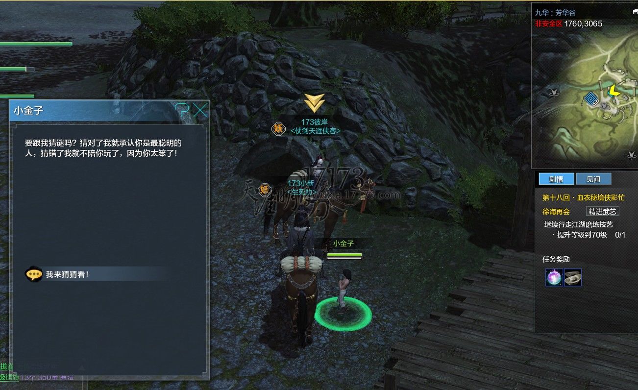 在九华:芳华谷内有一个未开放的任务,系统没有任何提示,必须自己去找一个叫“小金子”的NPC,坐标:1760,3065,小金子会在村里乱跑,要找一下。